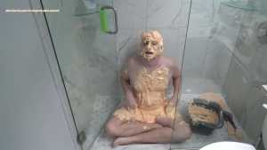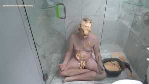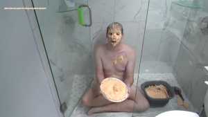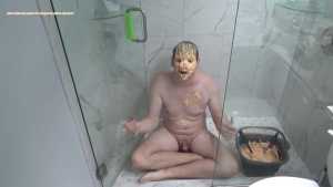 Just 1 pie and a bucket of slime for the spin for pie game, I am already messy from playing Pied versus challenger and sit naked in the shower to get really messy.
